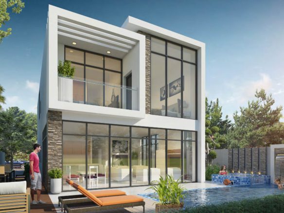 The villas meet international safety and environmental standards and have a fully-equipped kitchen, a private pool, a maid's room, large windows, and wide balconies with panoramic views of Dubai.
