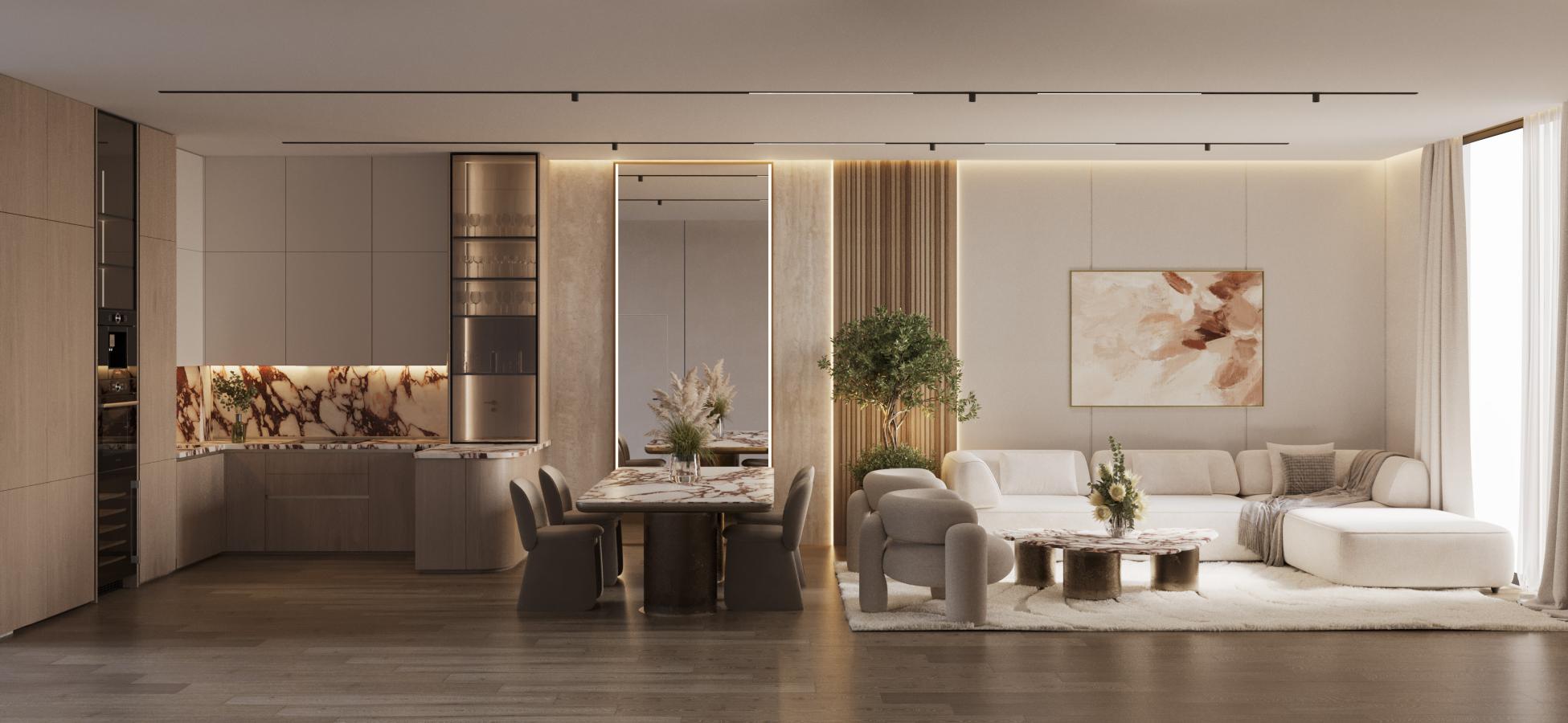 The interior design reflects the project’s ethos of refinement. Spacious and uninterrupted layouts create an airy and luminous atmosphere. High-quality finishes and premium materials enhance