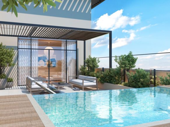 - State-of-the-art amenities, includes an expansive swimming pool, Jacuzzi, fitness studio, and rooftop garden.