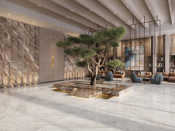 the lobby features seating areas perfect for relaxation and socializing. Modern lighting and minimalist decor create an inviting ambiance, making every entrance feel truly impressive.